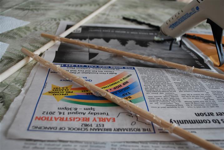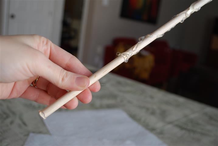 Now, heat up the glue gun. First, use the gun to put a ring of glue around the flat base. Then, put another ring about a hand’s width up the shaft. This forms the “handle” part of the wand.