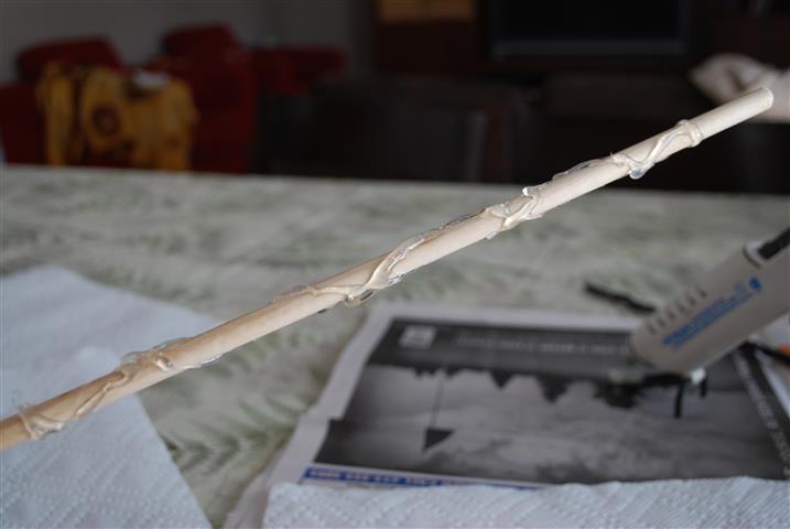 Then take the glue gun, and for shaft part above the handle, make a pretty pattern. What I do is spin the wand while applying the glue, then twirl around at the top and come back down, so it ends up making a criss-crossed pattern.