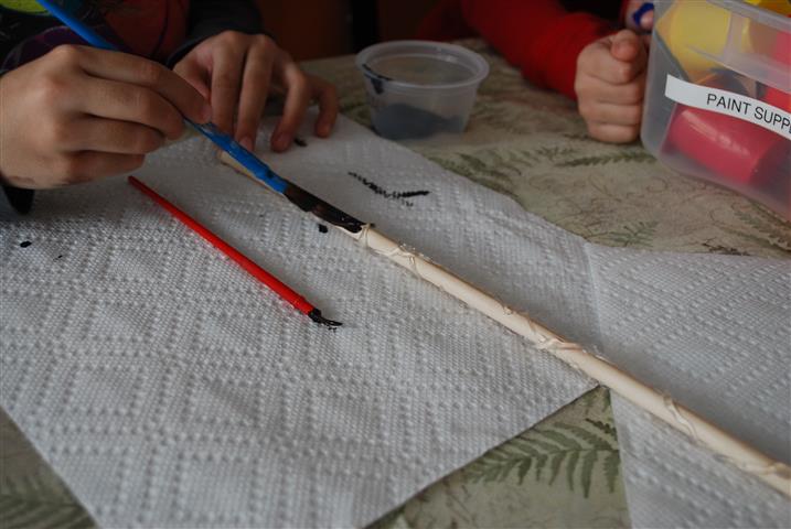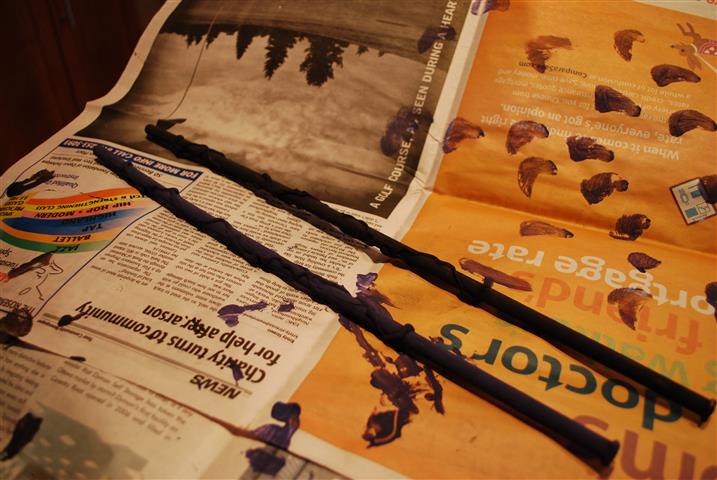 Once the glue is dry, it’s time to paint it. Previously, I always made the wands black, but the Little Miss asked for purple, so I tried to mix up the most dark, badass purple I could, and used that on hers. Last time I made these, I used a satin finish black wall paint I had kicking around from another project. This time, I just used Crayola craft paint. Both worked well, but the satin finish paint made for a cooler looking wand and also a nice, smooth feeling to the handle part, and the kids definitely prefer that. So if you have access to glossy paint, I’d recommend that; otherwise, just use craft paint and they’ll never know the difference.