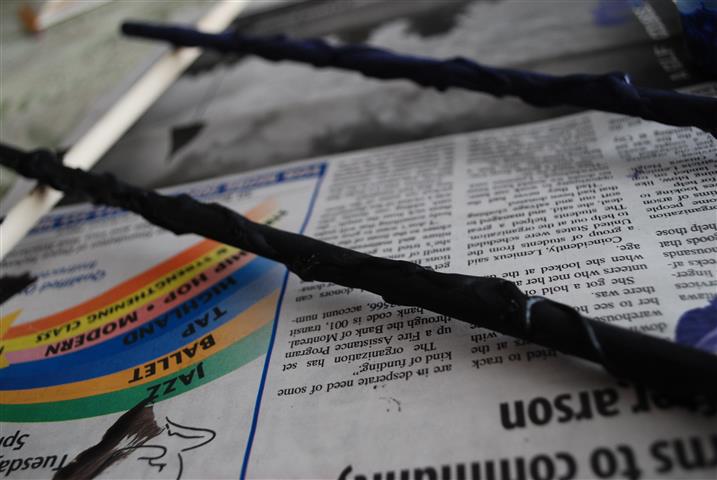 Time for the last step! Get some glitter glue – here the kids customized their wands by choosing their own colour of glue, and apparently various colours represent various magic and Reducto and blah blah. Squeeze a puddle of glitter glue onto a bit of newspaper. Dip your finger in the glittler glue and rub it on just the glue-gun-design parts of the wand, to highlight them.