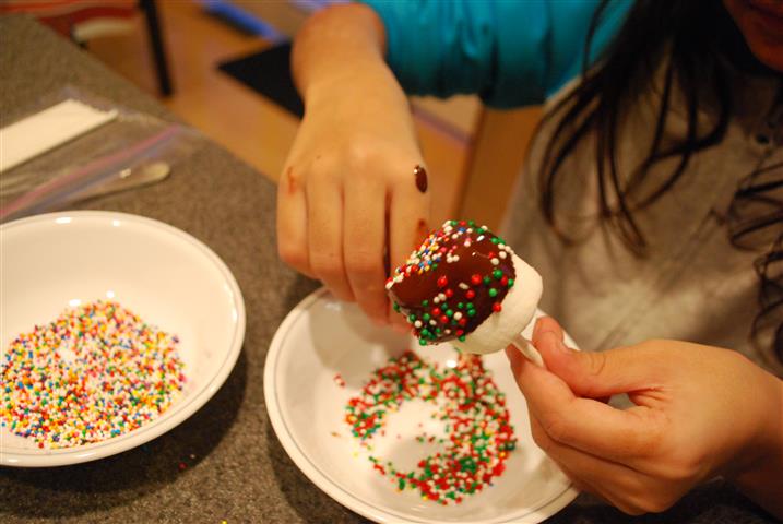Now hover the marshmallow over your chosen bowl of sprinkles, and sprinkle them on by hand, like so: