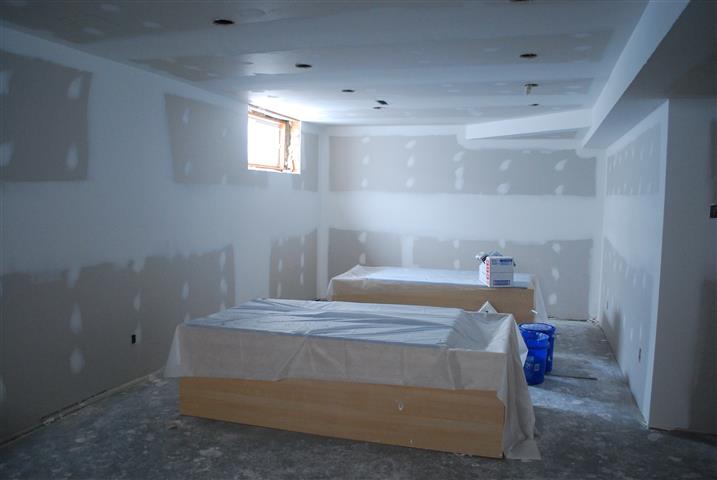 Since this is such a huge, open space, knowing our general plans for how we were going to use it was important, especially for deciding on where we wanted the outlets and lighting to be. Right now we have the TV area lights on one circuit, and the craft area lights on another circuit, and we ended up adding a few extra pot lights right over where the craft table and sewing table will be – definitely worth it, I think. Plus, we were able to make sure the bulkheads were tight enough to clear the wardrobes, and that we’d be able to fit three across (a tight fit, as our furnace is on the other side of the wall of the craft area, and needs a 3 foot clearance). I *think* we got everything we need in this space, but time will tell.