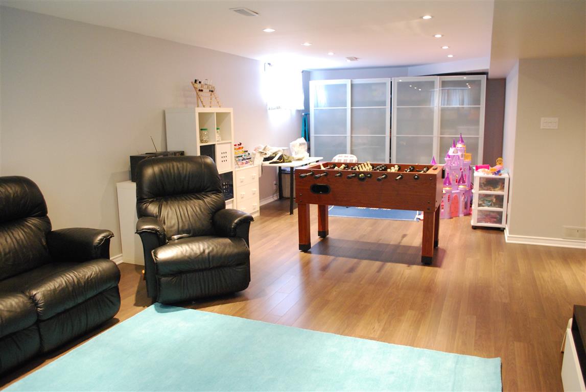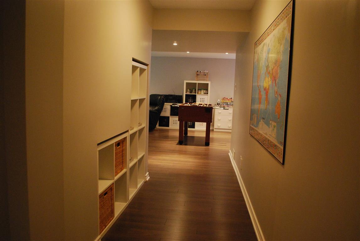 And notice that thing in the middle there – our new foosball table! I bought this one on Kijiji for $100 from a nice family that lives just three streets over from us. It was quite a happy union of needs. So far the kids are loving it – it’s getting a lot of playtime. I was originally going to put a crafts table here, but in the end I just couldn’t bring myself to put all the glue and beads and markers in our lovely brand new basement, so all that stuff stayed upstairs, and we went foosball instead.