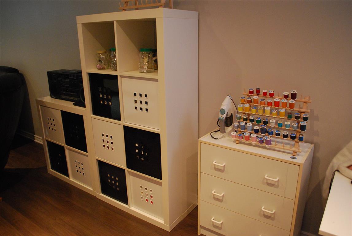 These shelves are behind the foosball table and hold all my sewing stuff: