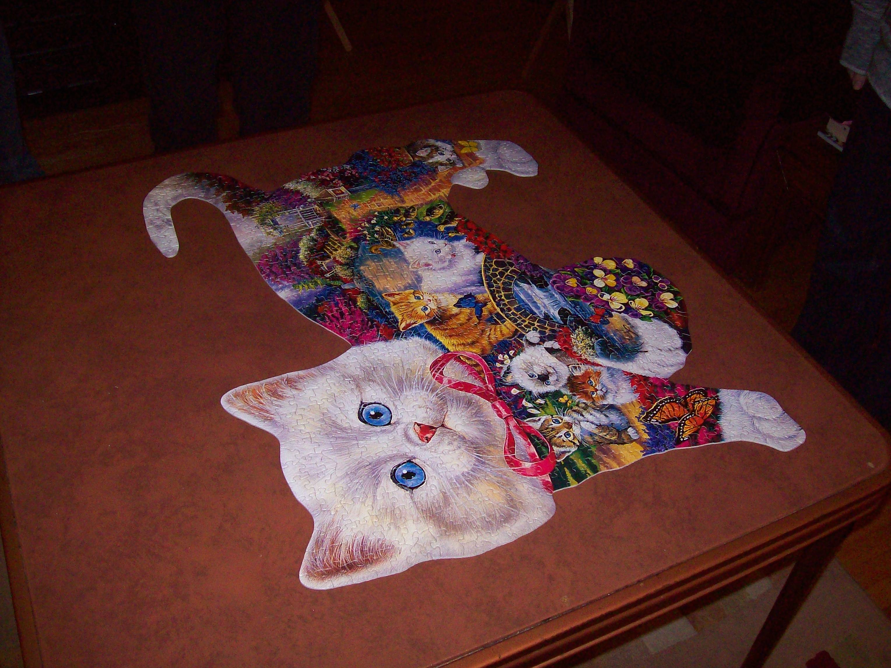 Puzzles. While at my mom’s house, I got out a 500 piece puzzle I found downstairs, and it was so fabulous – a kitty puzzle shaped like a kitty, containing several individual pieces shaped like kitties! Behold: