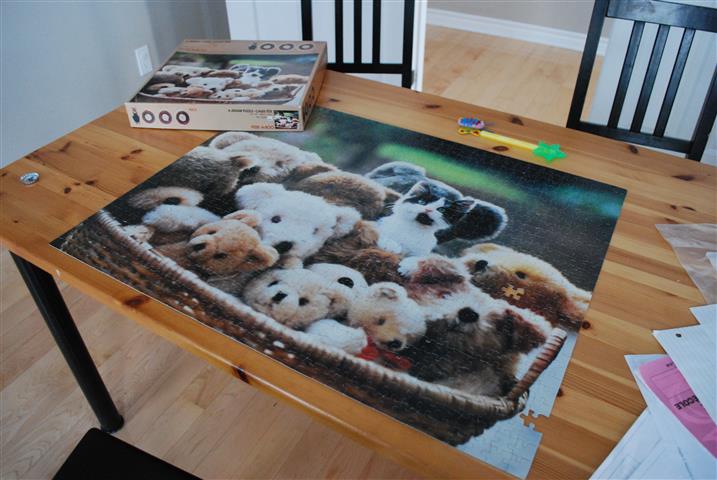 After we all had a lot of fun at my mom’s house doing a puzzle over the holidays, my mom gave me two old puzzles that were mine as a kid, both featuring teddy bears (a major motif in my preteen life). One was 500 pieces, and I did it over a couple of days after New Year’s with the Little Miss (the only other puzzler in the house).