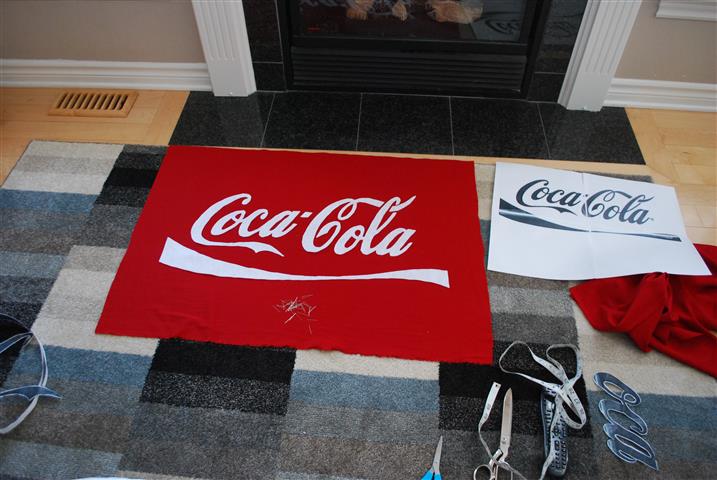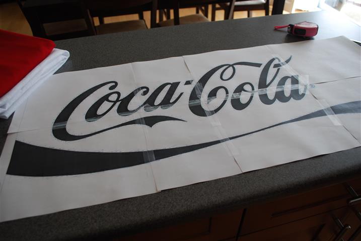To create the design, I grabbed the biggest logo I could find online and inserted it into a Word document, then printed it out in Poster Size (my printer can do this – take a one-sheet and print it huge, across four sheets). It turned out that even this was not big enough, so I ended up splitting the logo in half (using a graphics program) and poster-size-printing each half, then piecing it all together like a puzzle.
