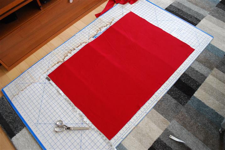 Next, cut two panels of the red fabric, one for the front and one for the back. Get a calculator, because you’ll need it, and have tea handy for fortification.