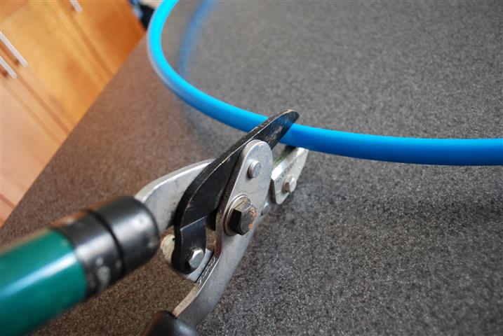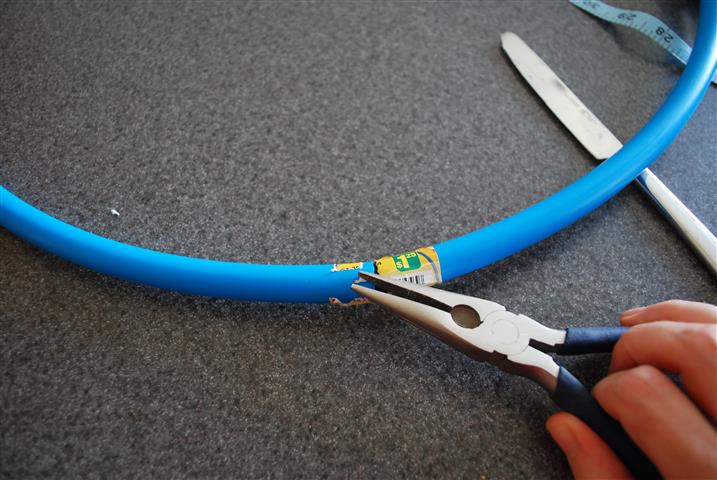 Then pop the hoop open and measure it carefully to determine how long you’ll need it to be. Mine, remember, needed to be 16 inches in diameter which means about 50 1/2 inches in total length around the outer edge of the ring. My rings were 20 inch hoops, so (more math) I needed to cut about 15 inches off of it, so I measured that out and marked it with a pen and then clipped it with my garden shears: