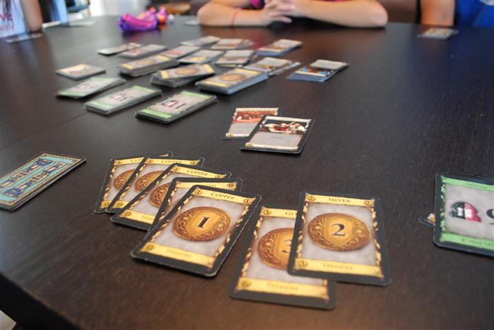 On your turn, you deal yourself a “hand” of five cards from your own personal deck. Then, you use the money you got to buy a card from the table that will be added to your deck. You’ll see that new card again next time you hit the bottom of your deck and have to shuffle your discard pile. The new card as well as your entire hand goes into your discard pile, and then you deal yourself a new hand from your deck for your next turn.