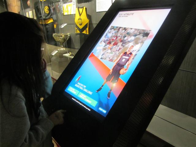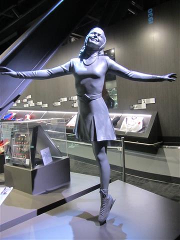 The great thing about the Hall of Fame is the interactivity. There’s hundreds of featured athletes and you can spend hours reading their little blurbs (which rock, by the way, so inspiring), but the museum really tries hard to make sport come alive. There’s dozens of clips of live events running all the time; there’s actual sports equipment, so you can try rowing or boxing Lennox Lewis or stopping a hockey puck; there’s cool computer games where you get a little spot of training from the likes of Steve Bauer or Kurt Browning or Donovan Bailey, then try your hand at their sport. There’s lots of life-sized statues of famous athletes so you can stand next to them, there’s iconic uniforms and sports equipment, there’s a pull-at-your-heartstrings movie about highlights of Canadian Sport.