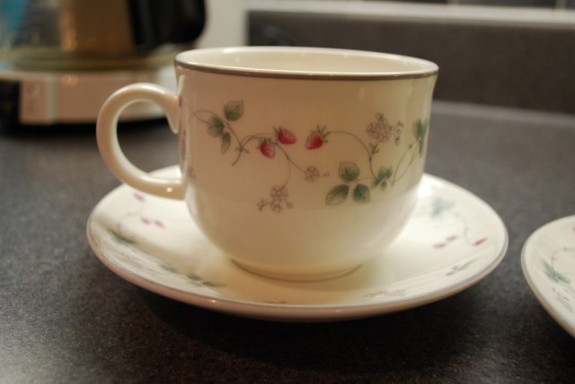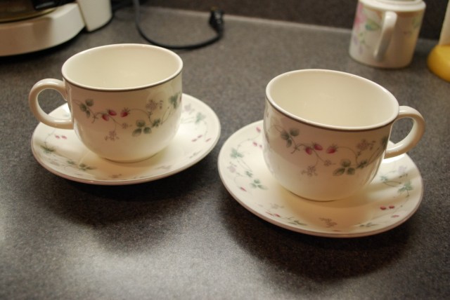 These two Royal Daulton teacups, scored at the Value Village for $2 each. I am not a regular at the Value Village, as I am not the kind of person who enjoys the Thrill Of the Shopping Hunt, and the big score that can sometimes come from there. I’m more of a “Dammnit, I need a shirt, I will go to the mall, grit my teeth, and buy the first thing I touch that is possibly my size” kind of person.