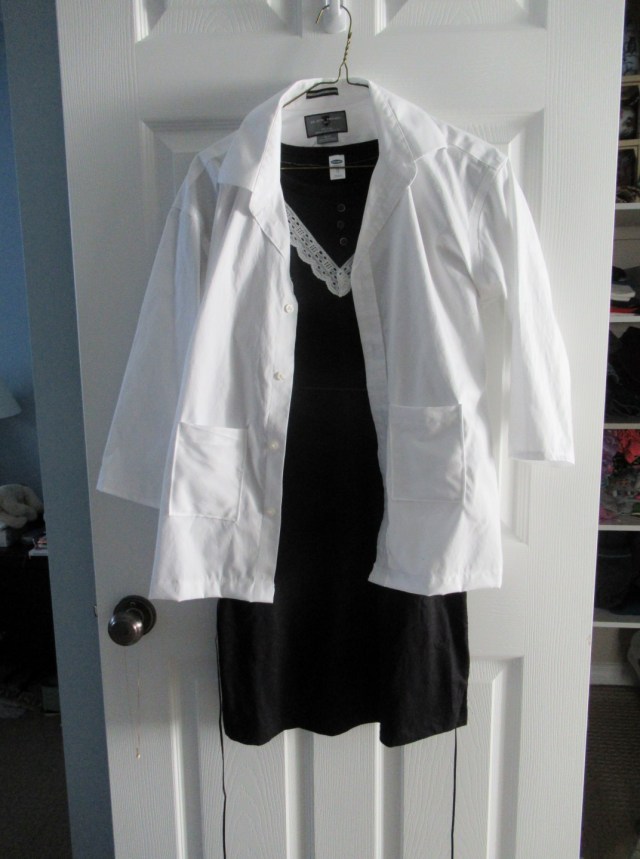 We are entering the crazy-busy time of year for us, the time when year-long activities like Girl Guides and piano and swim lessons are still going on, but spring activities like soccer and ultimate are starting up, and every subject has a major project due. I always go a little comatose in May and June, because everything is just so overwhelming and I’m racing around so much that I spend every free second I have being completely catatonic in front of Facebook. But I did make this Marie Curie costume for Little Miss Sunshine this weekend, for a school presentation she is doing later this month: